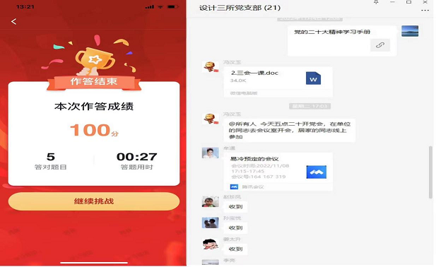 丰富载体,营造浓厚学习氛围。各基层党支部通过开展“三会一课”,转发主流媒体报道,分享学习辅导资料,线上线下引导党员通过积极参与集体学习、线上答题、视频学习等形式,拓宽学习渠道,丰富学习载体,全方位、深层次、多途径开展党的二十大精神学习宣传工作,多措并举营造学习党的二十大精神的浓厚氛围。