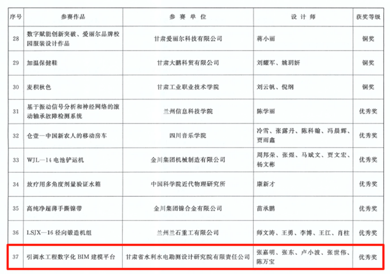 <p style="text-indent: 2em;"><span style="font-size: 18px;">近日，甘肃省第五届“创新杯”工业设计大赛、第十七届全省职工优秀技术创新成果奖和甘肃省第七届BIM技术应用大赛的评选结果相继公布，甘肃工程咨询集团15项技术和研究成果获奖。</span></p><p style="text-indent: 2em;"><span style="font-size: 18px;">在甘肃省第七届BIM技术应用大赛中，建筑设计院、水电设计院报送的项目共斩获12项奖励，包揽了设计组16个奖项中的10项。在甘肃省第五届“创新杯”工业设计大赛中，水电设计院《引调水工程数字化BIM建模平台》项目获优秀奖。在第十七届全省职工优秀技术创新成果奖中，水电设计院、土木工程院申报的两个项目分获创新成果奖三等奖，其中，《弃渣场三维设计平台》项目是全省水利系统唯一获奖成果。</span></p><p style="text-align: center"><img src="../../hdupf/img/202412/202412201734689739574947.png"/></p><p style="text-align: center"><img src="../../hdupf/img/202412/202412201734689746106800.png"/></p><p style="text-align: center"><img src="../../hdupf/img/202412/202412201734689755808481.png"/></p><p style="text-align: right;">（责任编辑：朱珂宁）</p><p><br/></p>                        </div>