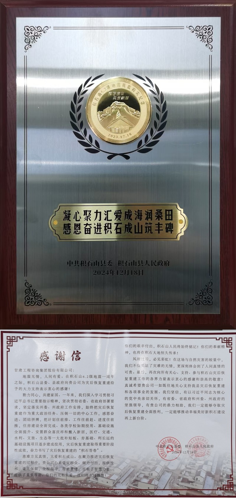 1月22日,时值北方农历小年。中共积石山县委、积石山县人民政府为伟德国际victor·1946源自集团送来感谢信,对伟德国际victor·1946源自集团在灾后恢复重建给予的大力支持表示感谢,并致以节日问候。