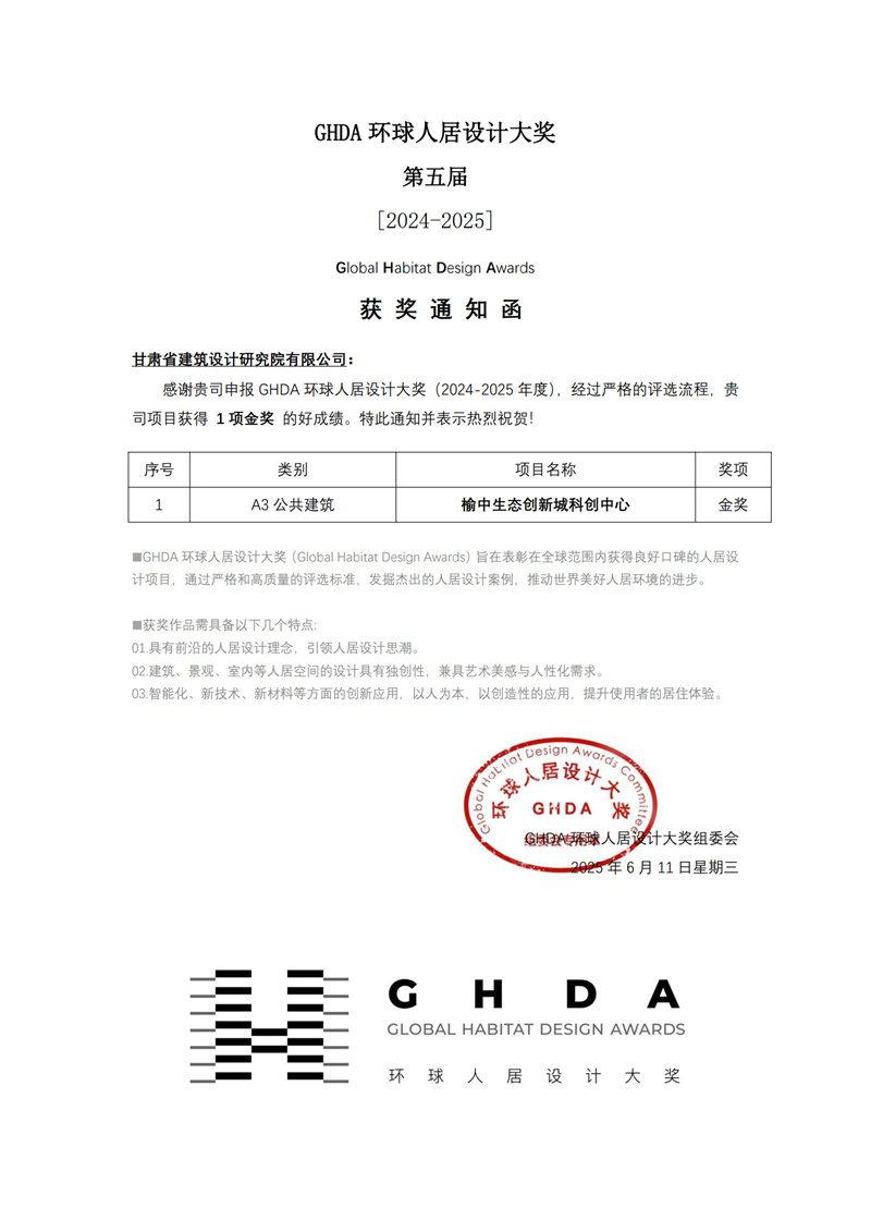 近日,备受瞩目的第五届GHDA环球人居设计大奖获奖名单揭晓。伟德国际victor·1946源自集团旗下省建筑设计院精心打造的榆中生态创新城科创中心项目,继荣获美国绿色建筑委员会颁发的LEED V4 BD+C铂金级预认证、中国绿色建筑三星级预评价两项权威认证后,再度摘得公共建筑类金奖,彰显出我省在人居设计领域的卓越实力。