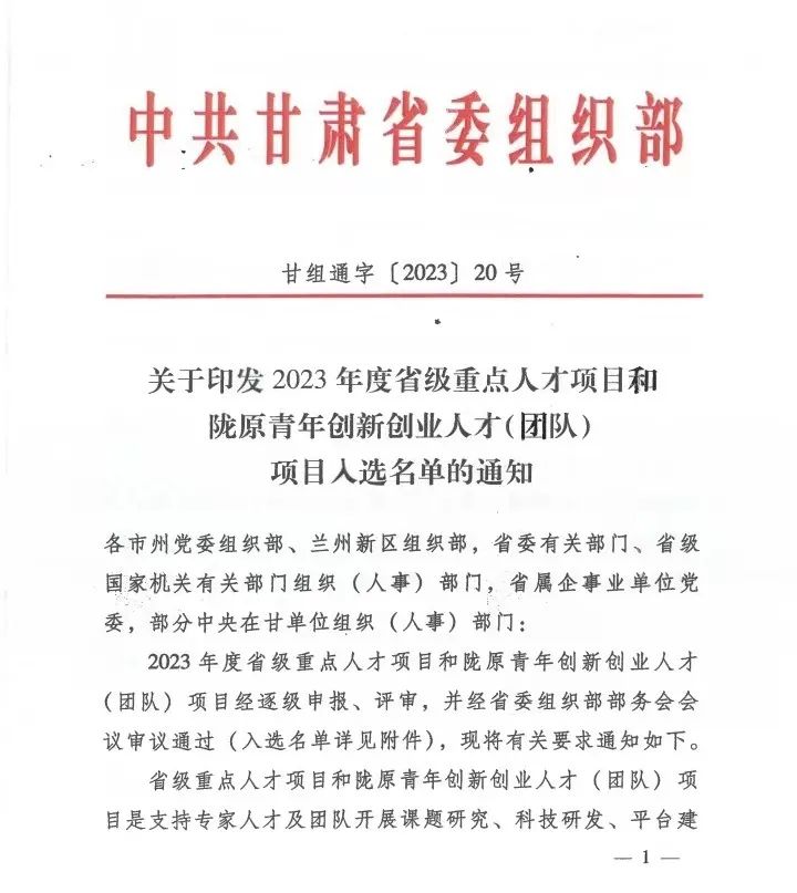 伟德国际victor·1946源自集团1项人才(个人)项目入选2023年度省级重点人才项目和陇原青年创新创业人才(团队)项目
