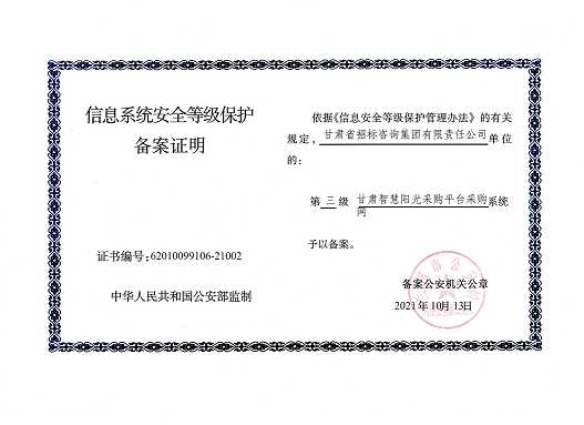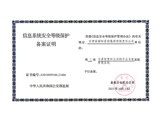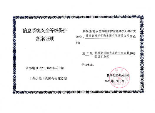 近日,由招标咨询集团负责开发建设的甘肃智慧阳光采购平台系统,以及甘肃智慧阳光采购平台采购网系统、大数据监管系统、招标系统、保证金系统、专家管理系统通过国家三级等保认证,系统管理安全能力获得业界最高标准。