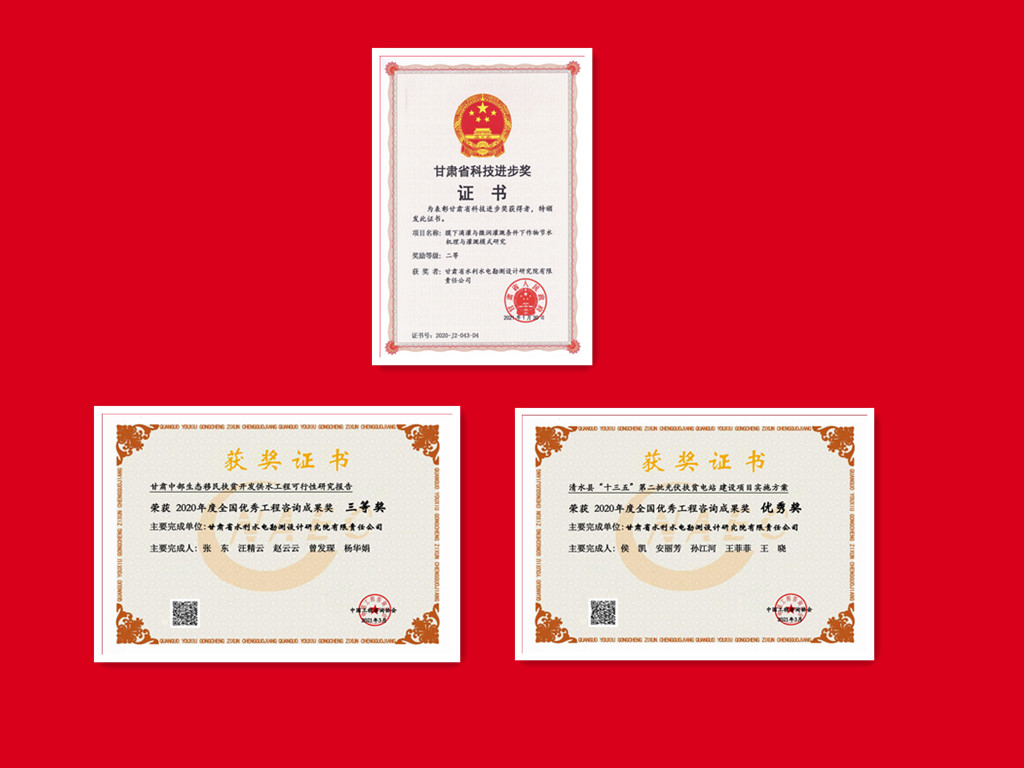 科研成果在工程实践中开花结果,多个项目获技术表彰奖励:《民勤县红崖山水库加高扩建工程》获甘肃省优秀工程勘察设计一等奖;《石羊河流域重点治理项目西营河专用输水渠工程》《古浪县生态移民暨扶贫开发黄花滩项目水利骨干工程》《大通河纳子峡水电站工程地质勘察》《昌马水库枢纽工程地质勘察》分别获甘肃省优秀工程勘察设计二等奖;《甘肃中部生态移民扶贫开发供水工程可行性研究报告》获全国优秀工程咨询成果奖三等奖;《清水县“十三五”第二批光伏扶贫电站项目》获全国优秀工程咨询成果奖优秀奖。