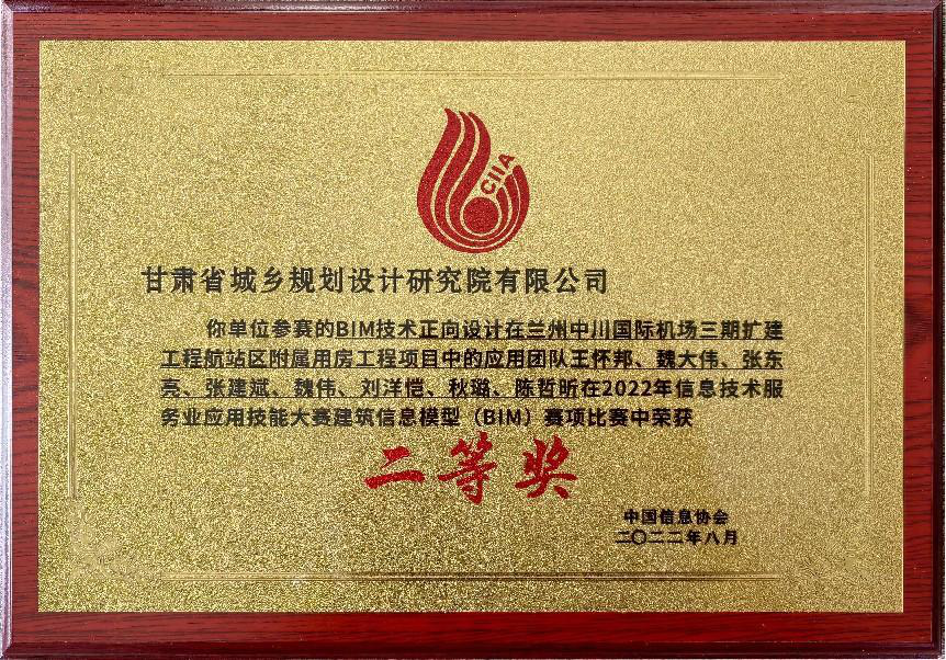 <p style="text-align: left; text-indent: 2em;"><span style="font-size: 18px;">近日，甘肃省城乡规划设计研究院有限公司“BIM技术正向设计在兰州中川国际机场三期扩建工程航站区附属用房工程项目的应用”荣获中国信息协会2022年信息技术服务业应用技能大赛二等奖。此次获奖是继该BIM应用项目荣获2021年甘肃省第四届BIM技术应用大赛设计组一等奖之后，再次摘得的国家奖项，也是规划设计院首次在国家级BIM技术应用赛事中获奖。</span></p><p style="text-align: left; text-indent: 2em;"><span style="font-size: 18px;"></span></p><p style="text-align: center"><img src="../../hdupf/img/202209/202209161663325634111800.png"/></p><p style="text-align: left; text-indent: 2em;"><span style="font-size: 18px;"></span><br/></p><p><br/></p><p style="text-align: left; text-indent: 2em;"><span style="font-size: 18px;">中国信息协会主办的中国信息化成果评选项目是经中共中央、国务院同意，我国信息化领域唯一保留的评选项目。“BIM技术正向设计在兰州中川国际机场三期扩建工程航站区附属用房工程项目的应用”能从全国的参赛作品中脱颖而出，荣获最具含金量的国家奖项，是对规划设计院BIM技术应用的高度认可。</span></p><p style="text-align: left; text-indent: 2em;"><span style="font-size: 18px;"></span></p><p style="text-align: center"><img src="../../hdupf/img/202209/202209161663325656725946.png"/></p><p style="text-align: center; text-indent: 2em;"><span style="text-indent: 2em; font-size: 14px;">BIM技术在建筑设计阶段正向应用逻辑框架</span></p><p style="text-align: left; text-indent: 2em;"><span style="font-size: 18px;">作为BIM技术成果应用的典型示范，兰州中川国际机场三期扩建工程航站区附属用房工程项目具有工程量大、涉及专业多、接口多、碰撞多等特点，运用BIM技术正向设计、协同各专业设计，提前解决了预见问题，有效控制了项目实施风险，取得了良好的效果。同时，按照依托重大项目培养人才，以人才促进项目质量提升的工作思路，规划设计院积极培育BIM技术研发中心，深入开展BIM技术研究，为实现BIM技术在建设项目全生命周期应用提供了技术支撑和人才储备。</span></p><p style="text-align: left; text-indent: 2em;"><span style="font-size: 18px;"></span></p><p style="text-align: center"><img src="../../hdupf/img/202209/202209161663325700471886.png"/></p><p style="text-align: left; text-indent: 2em;"><span style="font-size: 18px;"></span><br/></p><p><br/></p><p style="text-align: left; text-indent: 2em;"><span style="font-size: 18px;">下一步，规划设计院将充分发挥BIM技术在企业数字化转型过程中的重要作用，加快推进BIM技术在重大项目中的具体运用，以BIM技术赋能企业数字化和智能化转型升级，推进企业高质量发展。（责任编辑：田树芬）</span></p>                        </div>