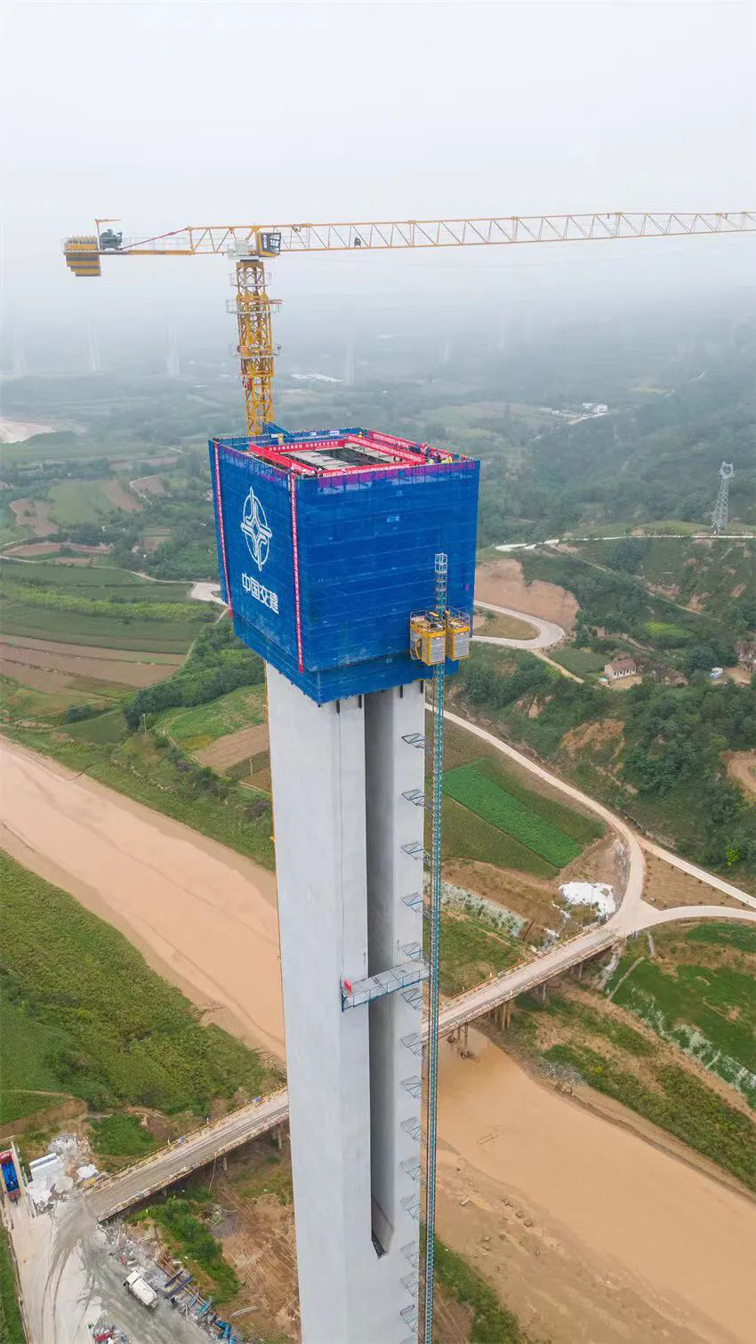 马莲河特大桥桥梁位于合水县西华池镇与何家畔镇交接处,跨越马莲河河谷,总长2208m,主桥桥长1400m,桥宽25.5m。沟谷最低处至桥面最大高差为196m,16#主墩墩身最大高度178米,墩身共计使用钢筋2258.721吨,C50混凝土11431.9m³。该桥系目前国内黄土地区在建跨度最大、墩柱最高、联跨最长的矮塔斜拉桥。