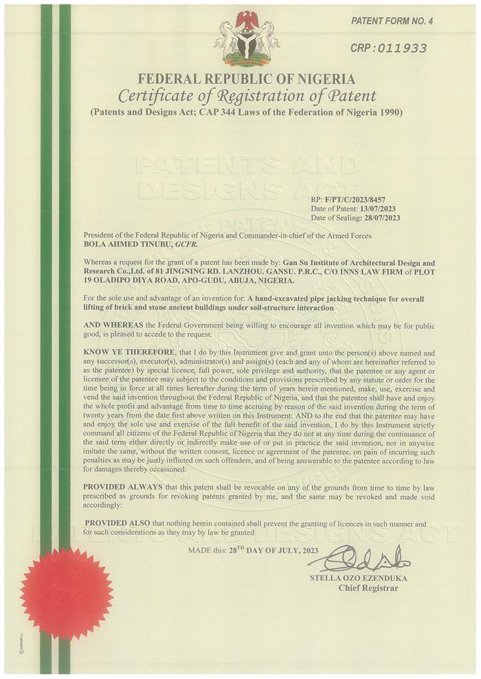 日前,非盟知识产权局对省建筑设计院王江龙等申报的“土-结构相互作用下砖石结构古建筑整体顶升手掘式顶管技术”(A hand-excavated pipe jacking technique for overall lifting of brick and stone ancient buildings under soil-structure interaction)进行授权,为省建筑设计院后续承接援外项目及国外项目给予了坚实的技术支撑。