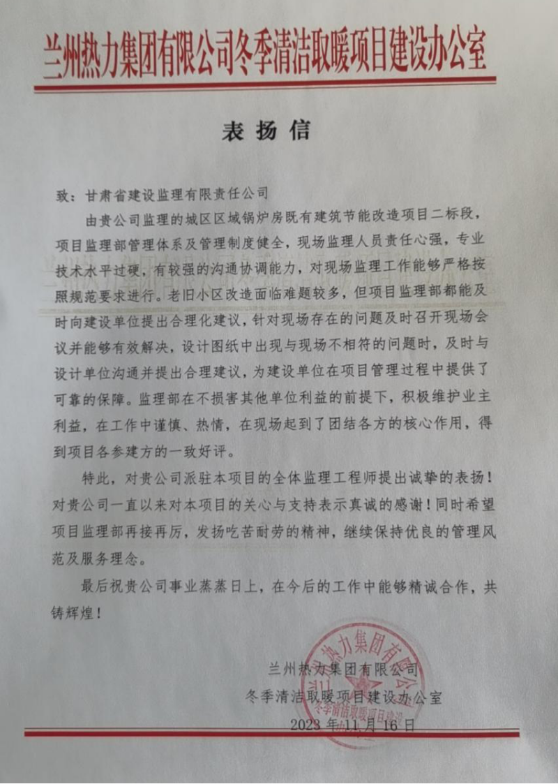 近日,省建设监理公司收到兰州热力集团有限公司冬季清洁取暖项目建设办公室发来的表扬信,对省建设监理公司城区区域锅炉房既有建筑节能改造项目二标段监理部全体人员表示感谢。