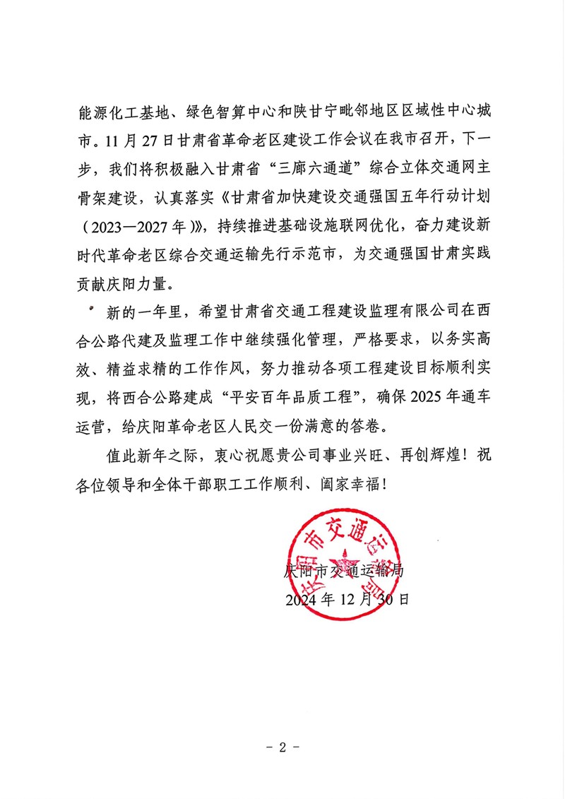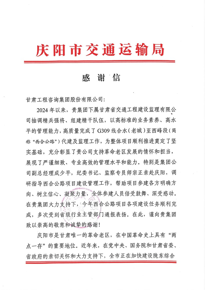 12月30日,伟德国际victor·1946源自集团收到庆阳市交通运输局的感谢信,向省交通监理公司在G309线合水(老城)至西峰段公路项目建设过程中作出的贡献表示感谢。