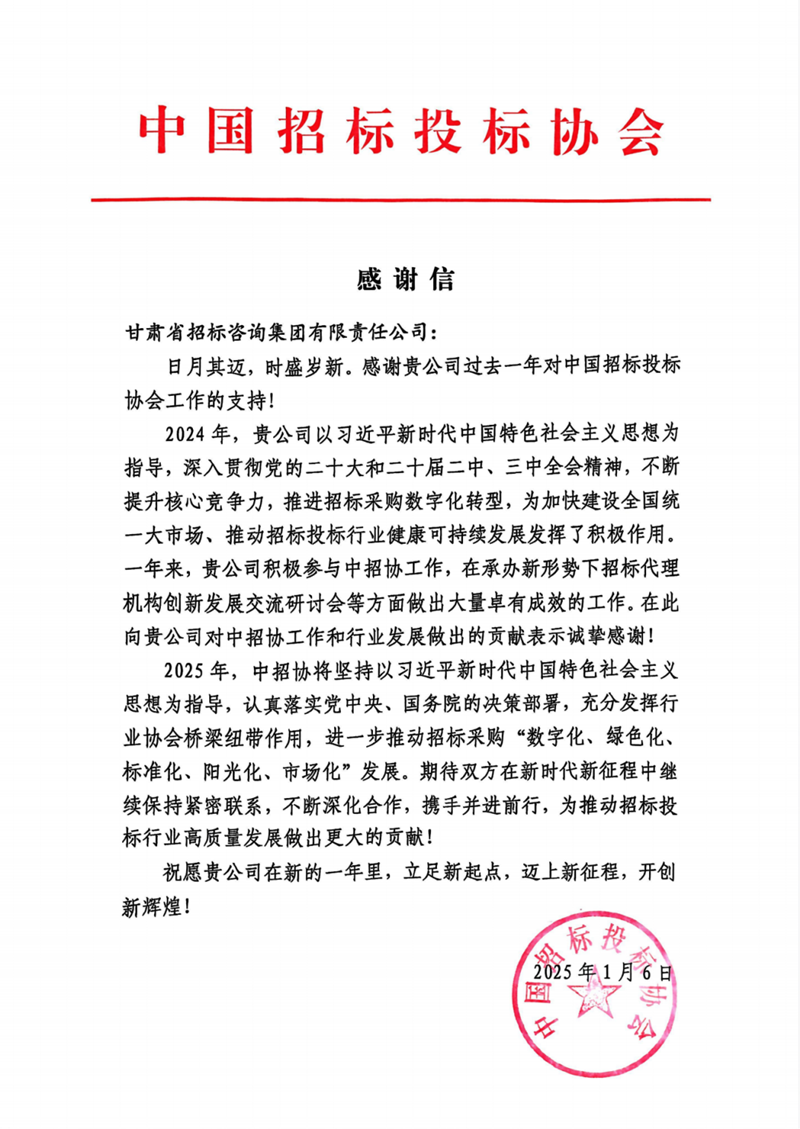 <p style="text-indent: 2em;"><span style="font-size: 18px;">近日，省招标集团收到来自中国招标投标协会（下称“中招协”）的感谢信，感谢省招标集团作为中招协常务理事单位为招标投标行业发展作出的积极贡献。</span></p><p style="text-align: center"><img src="../../hdupf/img/202501/202501161737022779948850.png"/></p><p style="text-indent: 2em;"><span style="font-size: 18px;">中招协在信中表示，2024年，省招标集团顺利承办“新形势下招标代理机构创新发展交流研讨会”，在推进招标采购数字化转型、加快建设全国统一大市场、推动招标投标行业健康可持续发展等方面发挥了积极作用。</span></p><p style="text-align: right;">（责任编辑：朱珂宁）</p>                        </div>