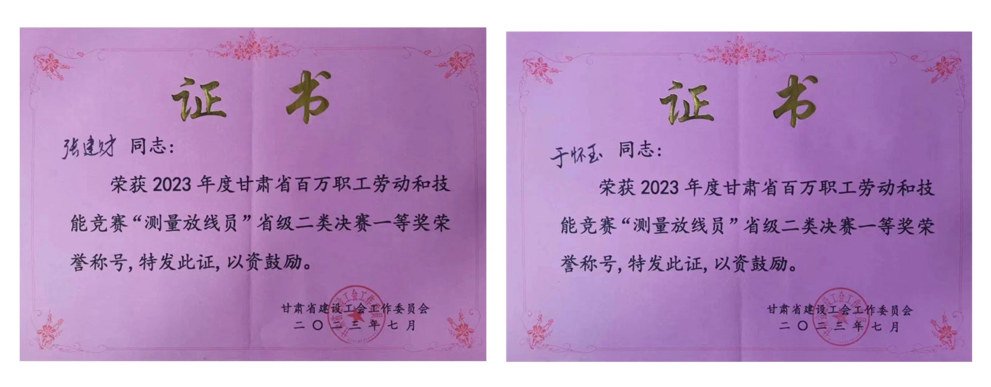 近日,从省建设工会“2023年度甘肃省百万职工劳动和技能竞赛”组委会传来好消息,省建筑设计院选派的岩土技术中心、岩土工程公司张建财和于怀玉两名同志,荣获2023年度甘肃省百万职工劳动和技能竞赛“测量放线员”省级二类决赛一等奖荣誉称号。